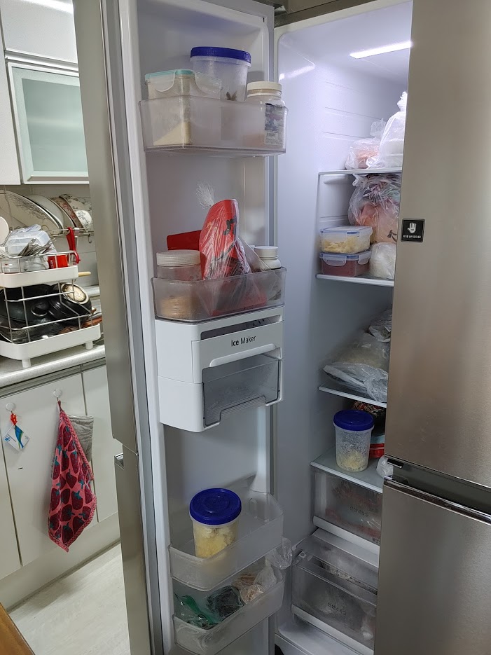 문 4분의 1을 열 수 있는 게 이 냉장고의 특징인데 (요즘 4짝 다 따로 열리는 마당에 ㅋㅋ)