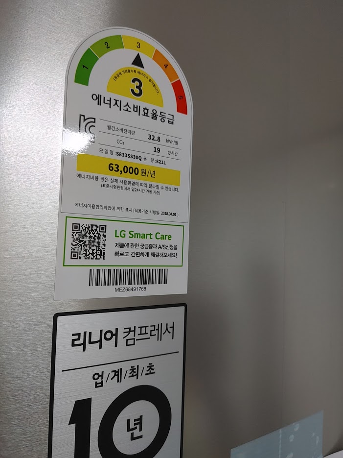 리니어 컴프레서 10년 보증이고 전기세는 1년 63000원, 에너지 등급은 3등급입니다. 냉장고 용량은 821L입니다.