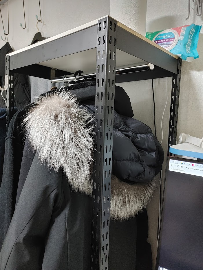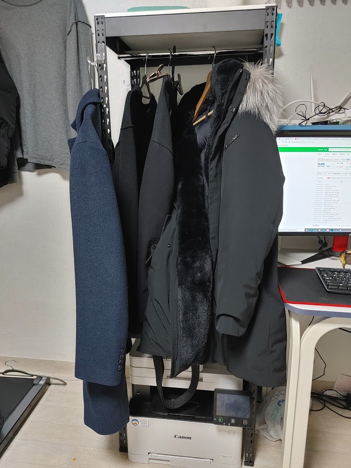 옷장이 있긴 하지만 ㅋㅋ 철재 행거에 걸어두는 게 겨울철에는 확실히 편합니다.