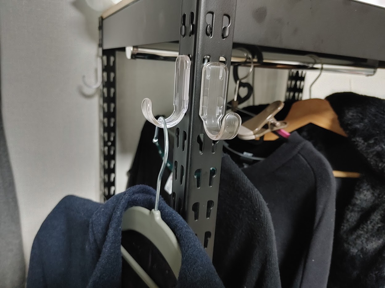 철재 기둥 사이에 꽂을 수 있는 다용도 후크를 줍니다. ㅎㅎ 그냥 잠바같은 거 걸어둘 수 있어서 매우 편리합니다.