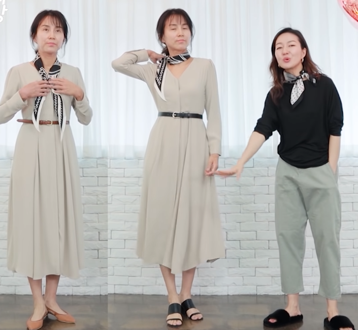 스카프 착용 위치, 구두, 벨트 색만 바꿔도 느낌이 각각 달라집니다.