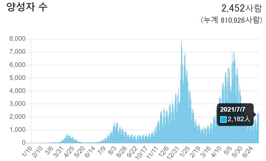 양성자 수는 7월 7일 2182명, 7월 10일 2452 7월 12일 1,492명입니다.
