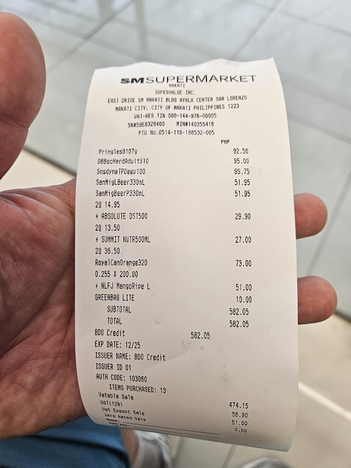이 영수증은 마켓에서 582.05 페소가 나왔는데요.