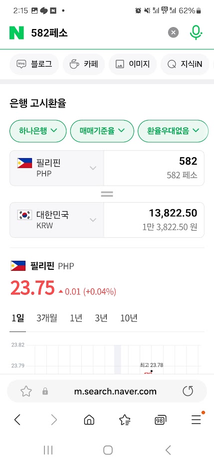 바로 네이버에서 필리핀 페소 환율 검색했는데 1페소 당 23.75원이 나왔고