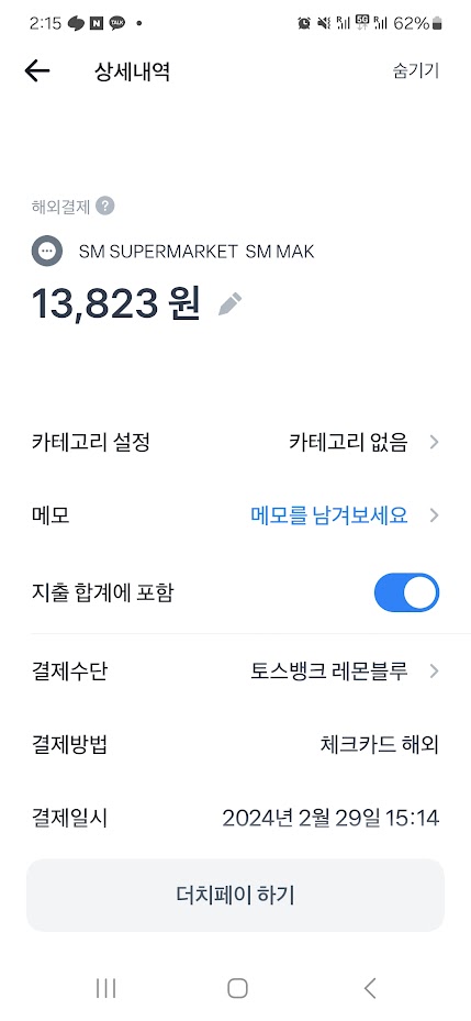 안녕하세요. 필리핀 마닐라에서 토스외화통장 체크카드로 결제를 사용했습니다.