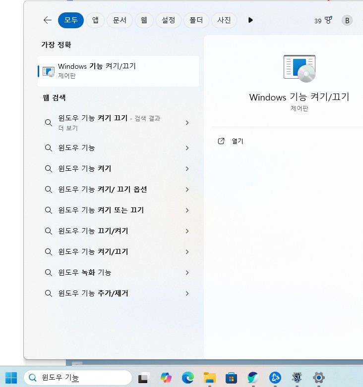 윈도우 돋보기에 윈도우 기능을 적어서 Window 기능 켜기/끄기를 실행을 하면 된다.