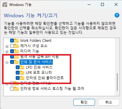 인쇄 및 문서 서비스에 있는 모든 체크박스에 체크를 해주고 확인을 누르면 끝이다.
